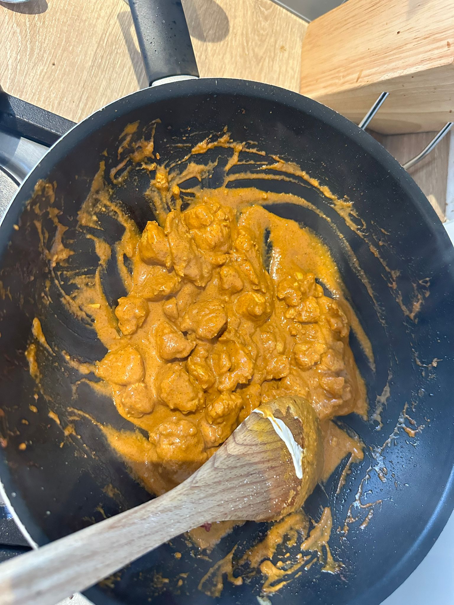 - Once the chicken is cooked, pour the prepared sauce over it, mixing well to coat. Simmer for a few more minutes until everything is piping hot and the flavours meld.
