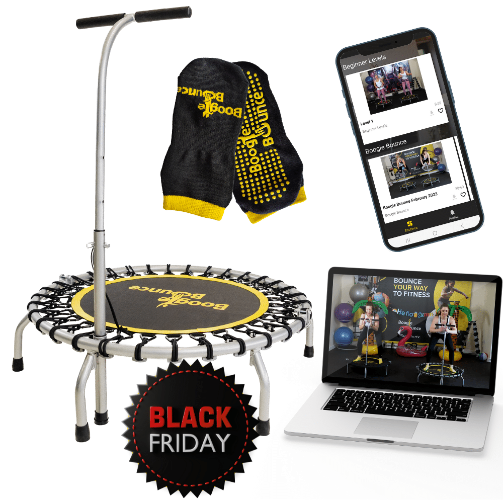 Rebounding with Boogie Bounce is a great dance-inspired workout for beginners at home! You can perform this low-impact aerobic exercise while jumping or dancing on a mini-trampoline. It allows you to work your body, engage your cardiovascular system, and increase your endurance without burdening your joints.